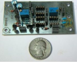 The finished PC board with all components and IC sockets installed, is ready for wiring to the Digital Volt Meter, the RG-174 pigtail to the rear panel mounted BNC connector, and the power on-off switch.