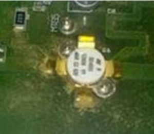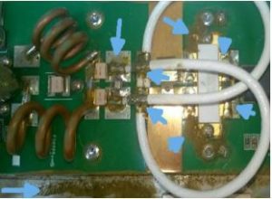 Once the transmitter was shown to operate at nominal power levels, it was time to look inside. Notice the area around the power transistor.