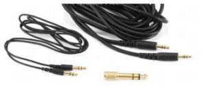 The Monoprice 8323 comes with two 1/8th inch to 1/8th cords, a 4-foot cord, and a heavier 8-foot one. They also come with the ubiquitous 1/8th to ¼ inch adapter.