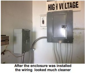 Then, with the wires properly in conduit, I was able to re-install the breaker box cover and the elbow cap – initially removed so the wires for the tower light breakers could be attached to the hanging transformers.